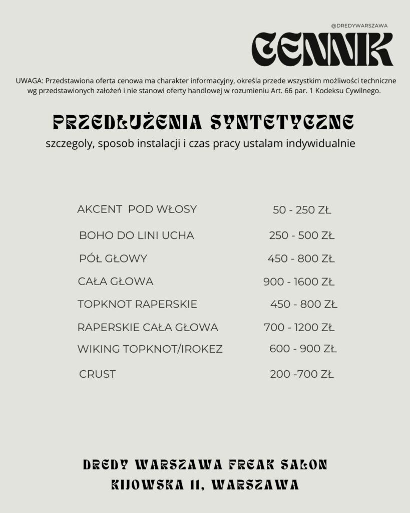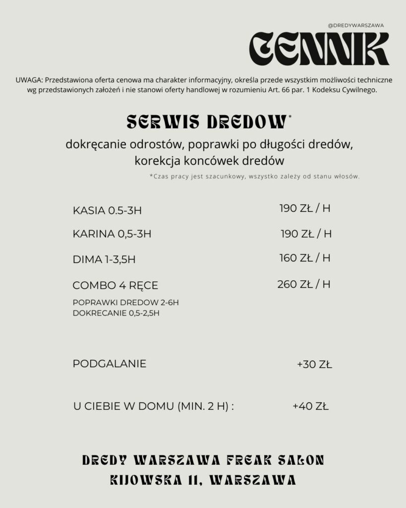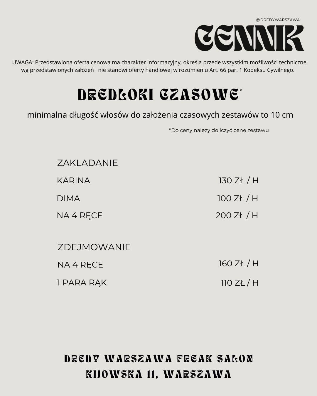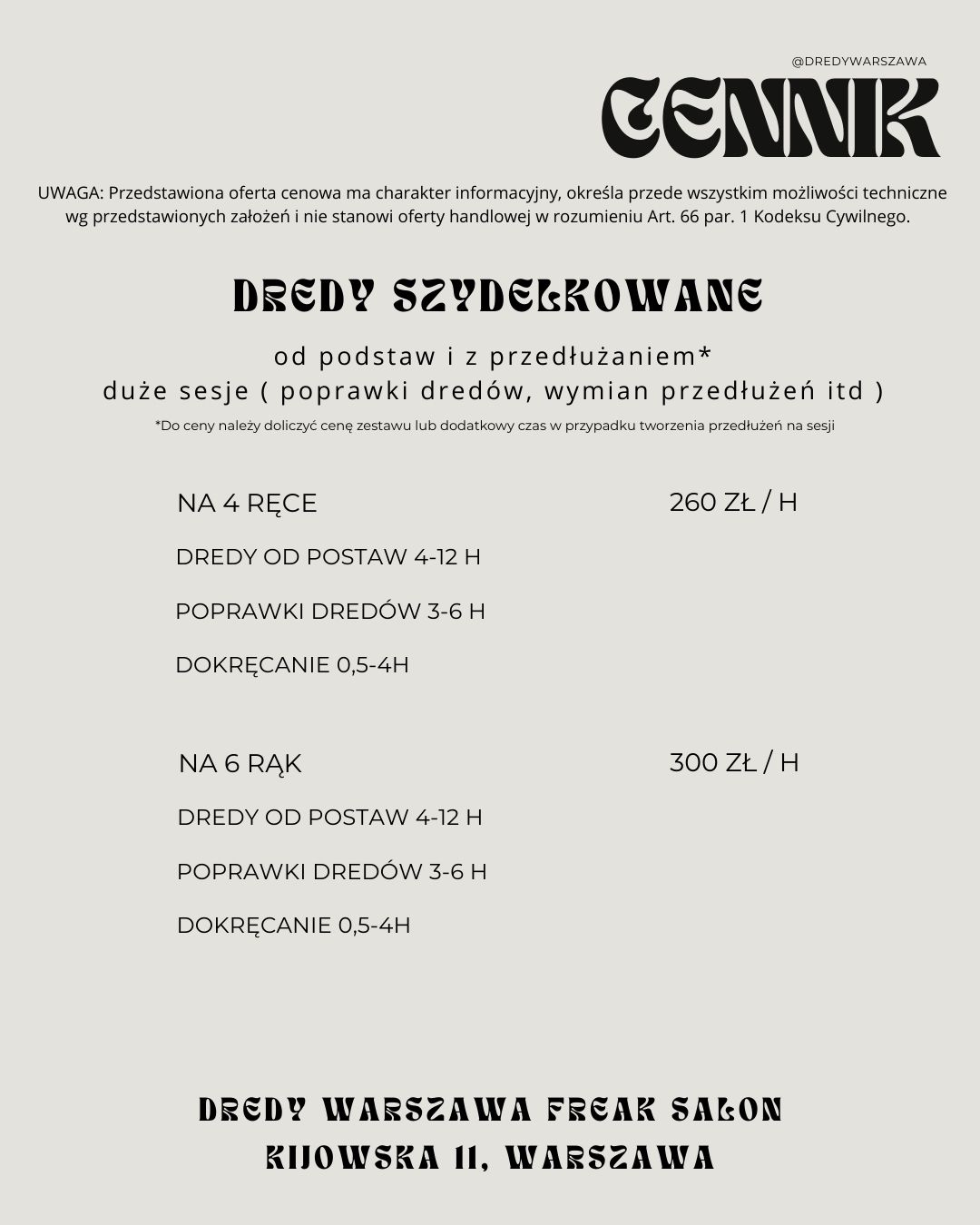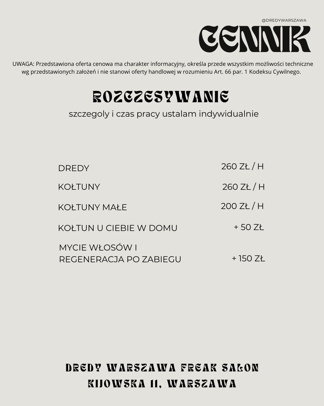 Ile kosztują dredy / dredloki i inne usługi w Freak Salon? Sprawdź nasze ceny i inne ważne informacje. Podany czas pracy i koszt jest orientacyjny i w dużej mierze zależny od stanu, długości oraz gęstości włosów/fryzury/kołtuna czy po prostu zestawu. Działamy tylko pod zapisy.
