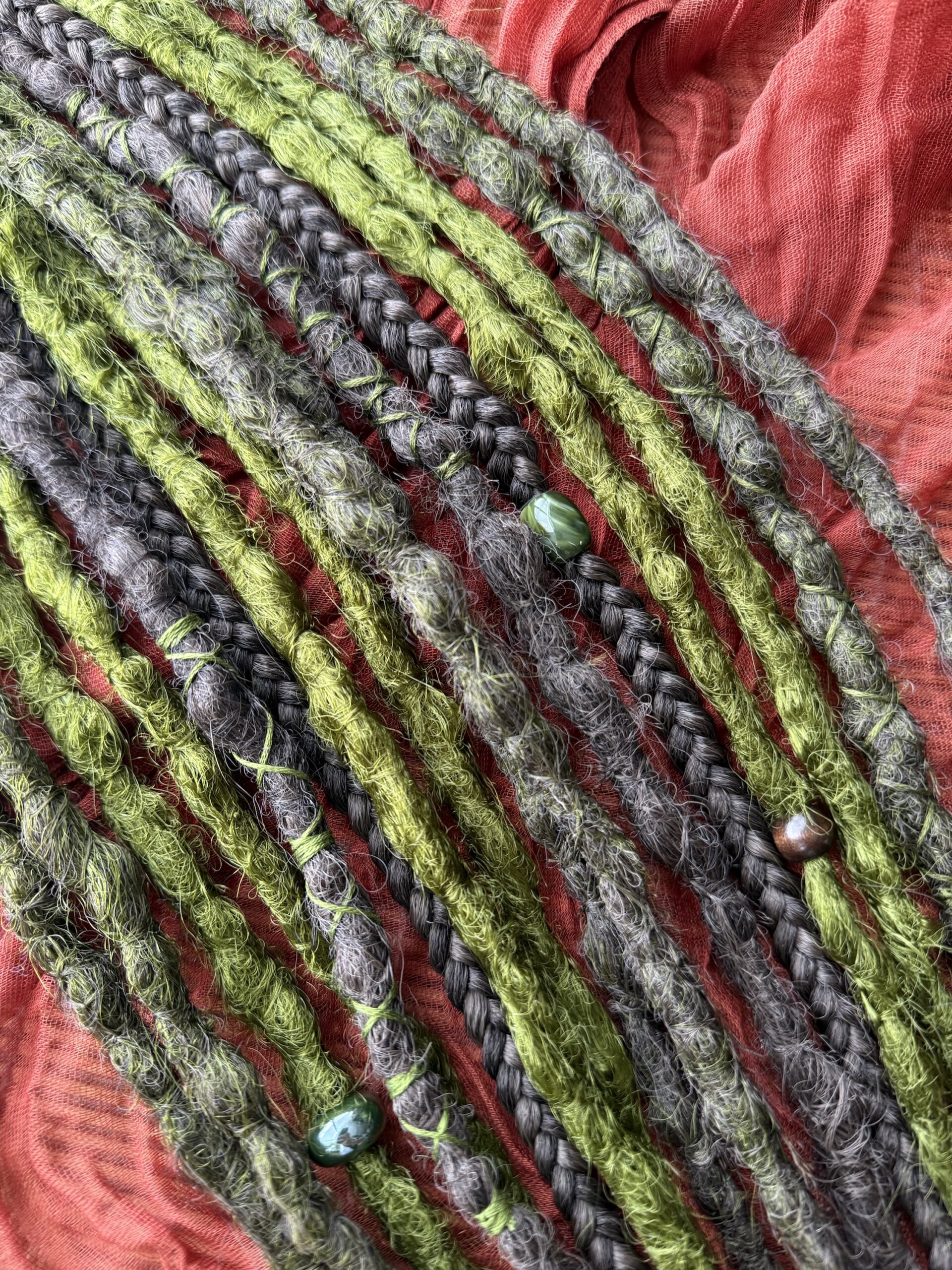 Tekstura: szydełkowane lekko nieregularne dredy, warkoczyki