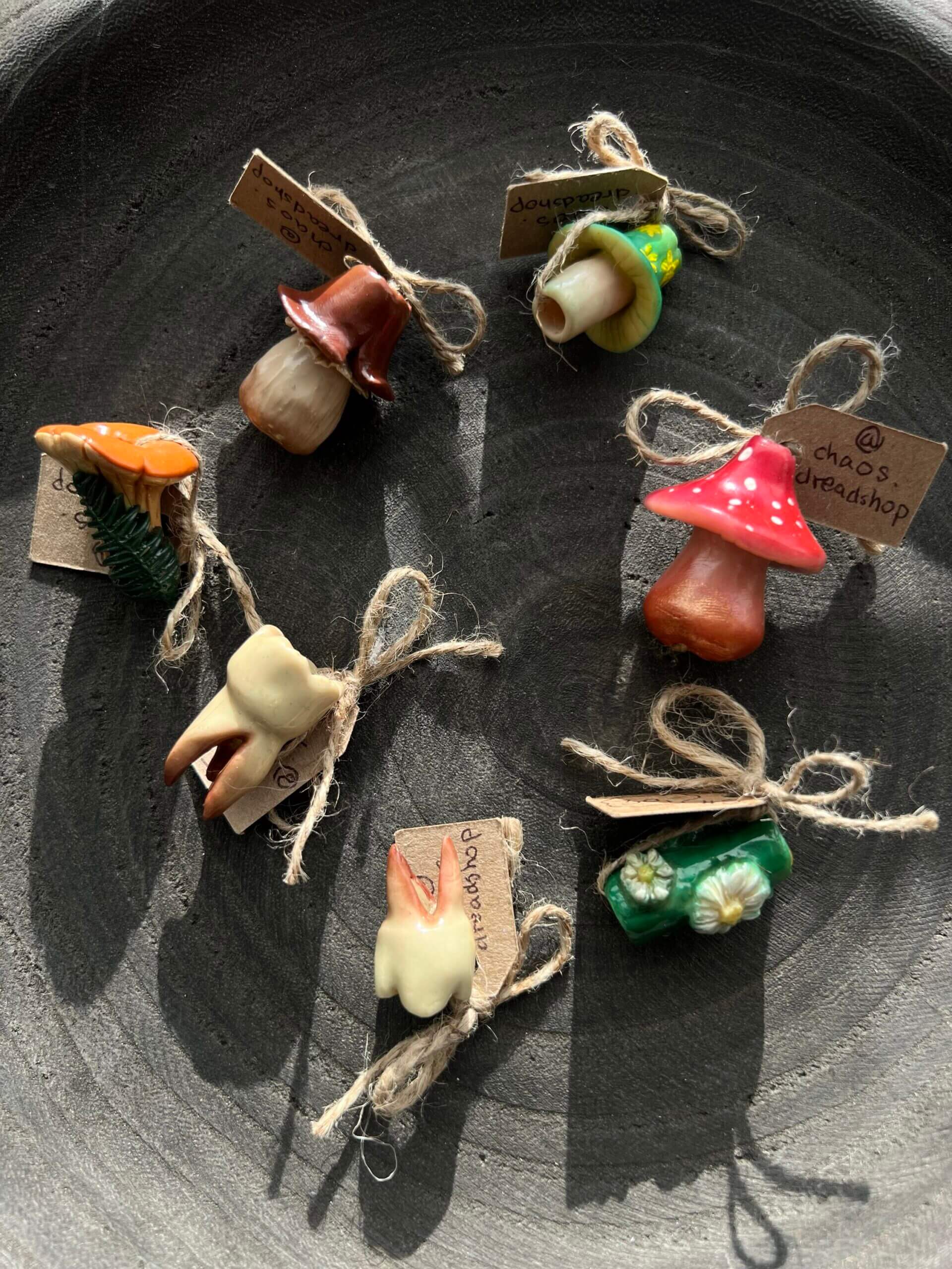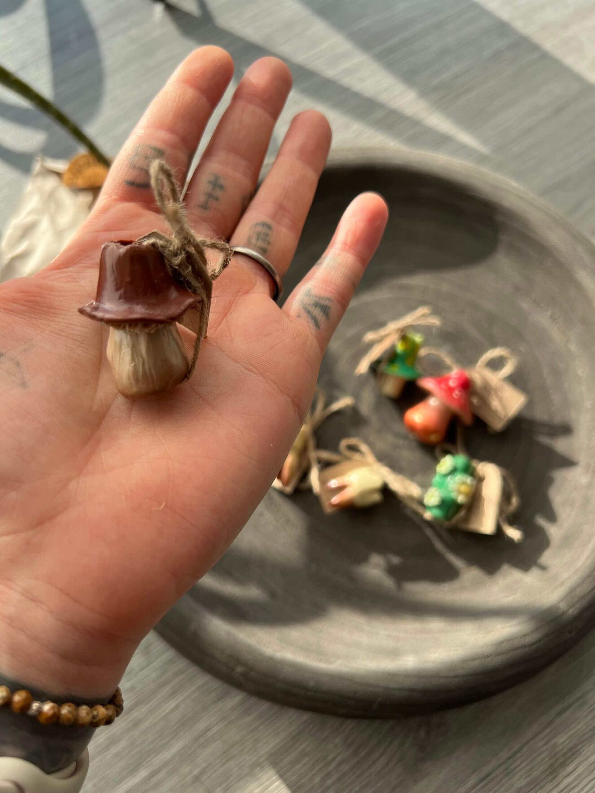 Każdy element to mała forma artystyczna – grzybki, leśne motywy i ząbki w unikalnych kolorach i kształtach.